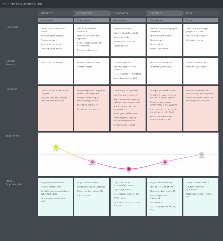 Caption: Re-thinking the original workflow which was dependent on paper timecards, manual delivery, and delayed approvals, creating friction for both workers and office administrators.