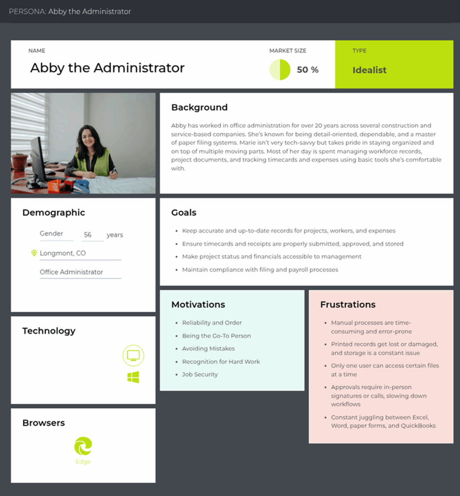 Caption: One of the primary personas created to guide the design of approval workflows, reporting needs, and administrative efficiency.