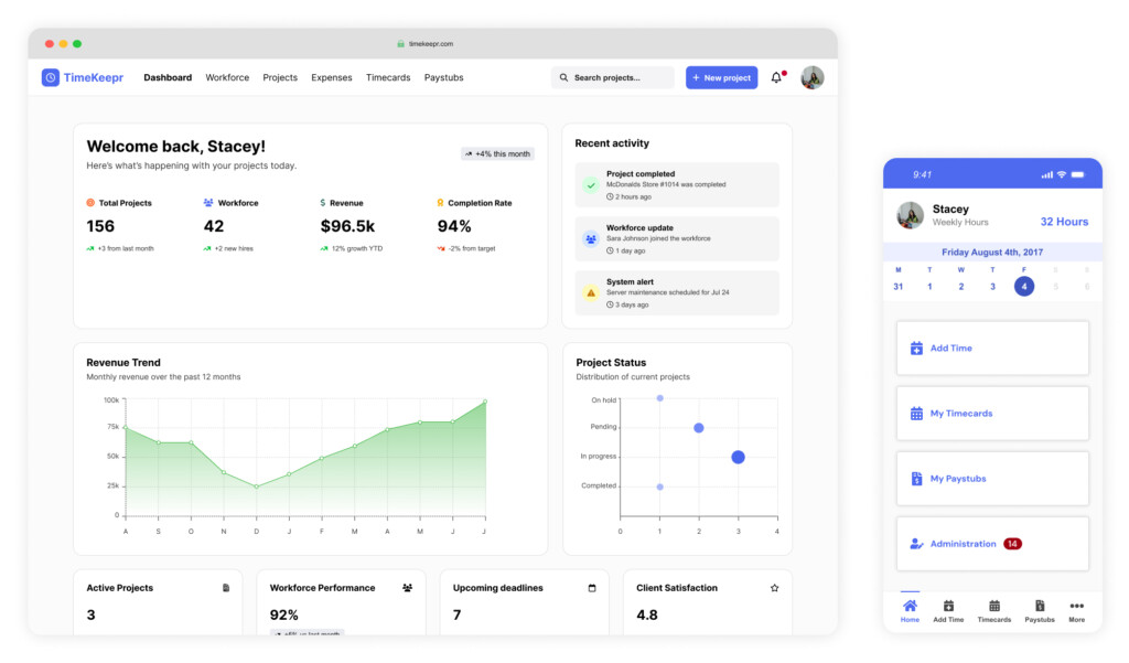 TimeKeepr is a multilingual mobile time and project tracking app for iOS and Android that simplifies timekeeping and payroll processes for contractors, small businesses, and distributed teams. In addition to the mobile experience for workers, a desktop version was created for administrators to manage approvals, monitor workforce activity, and support payroll operations.