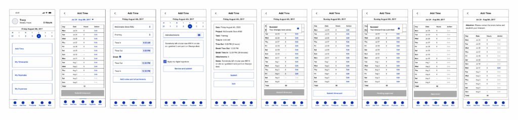 Caption: A wireframe flow used to clarify the logic and interaction design of timecard creation and submission.